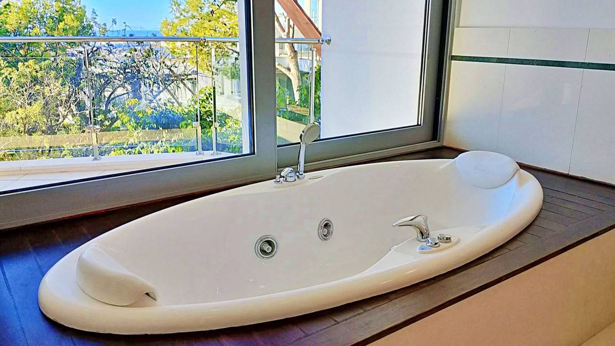 On the first floor, the master suite boasts stunning vistas of the sea and Gibraltar, complemented by a luxurious bathroom featuring a Jacuzzi, shower, and dual vanities. Two additional bedrooms, each with en-suite bathrooms, complete this level.
