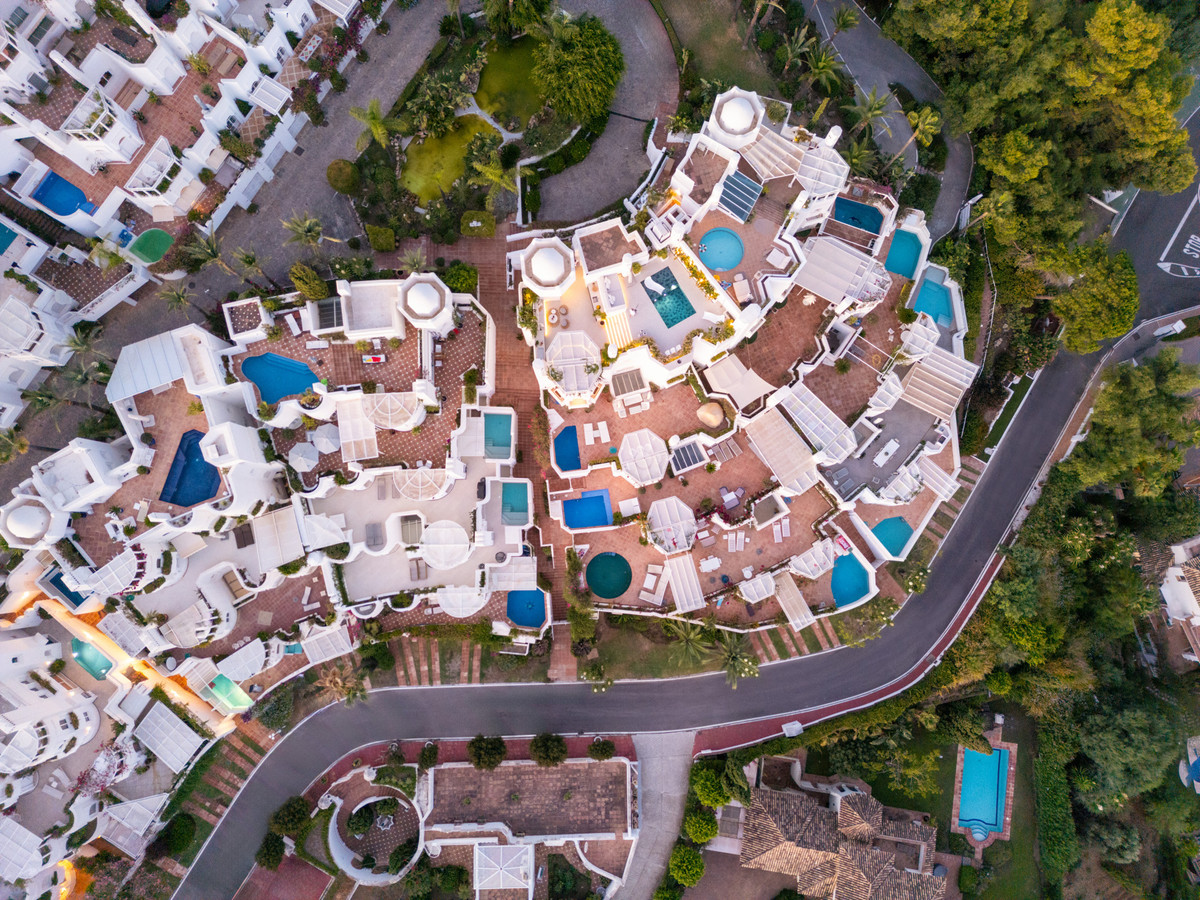 The community of Jardines Colgantes, also known as Marbella Hill Club, is celebrated for its exclusivity, privacy, and low-density development. Wide, tree-lined streets and meticulously landscaped gardens create a tranquil atmosphere, while the elevated location ensures residents enjoy both security and breathtaking views. Properties in the area range from traditional Andalusian-style villas to contemporary residences, creating an elegant yet diverse architectural landscape.
