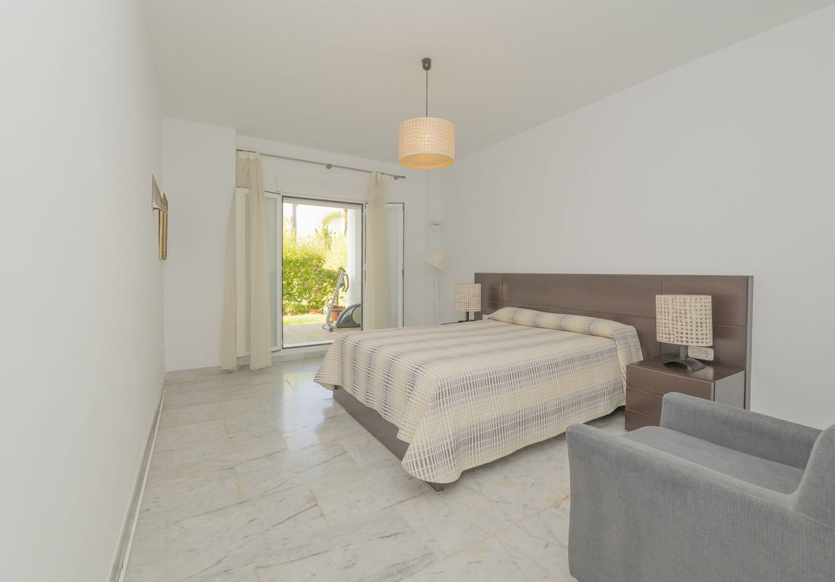 Come and meet the Paradise embodied in this charming Semi Detached House, epithome of a a Rest retreat, a quiet hideout, at a first line beach complex and despite that, tranquil, discreet and with 24/7 security ... at a mere 4km from Marbella downtown and nestled in the renonwned Bahía de Marbella Macro Community. We are talking about a Andalusian Rustic Style complex, with abundance of properly taken care of green areas, witewashed houses, with winding paths that give the impression of having a walk in a traditional Andalusian "Pueblo Blanco". This is a corner unit what increases its privacy and discretion. The dwelling display, determined by the land slide, is as follows: On the "acting" ground floor which happen to be the upper floor we enter to a huge living room, decorated in a minimalist approach what enhances the impression of the size, with a separate dining area and access to the 20sqm terrace, besides a fully fitted kitchen, separated laundry room with an ample storage wardrobe, and a complete bathroom. On the lower level, a distributor hall welcomes us leading to the two main bedrooms, both with access to the private 40sqm garden, and a complete bathroom; besides a third room that can be aimed as a living room or a third bedroom. The complex, apart of all the previous features boasts two different pool areas, social club for owners open in medium and high season, direct accesses to the white sandy beaches of Bahía de Marbella as well as the "Pasarela Litoral" a wonderful wooden promenade planned to connect the whole of the Costa del Sol along the beach. Using this promenade we will be able to go to Marbella Downtown without leaving the beach in a gorgeous walk path near the shore. The property is in perfect condition and ready to be used, either as a first home or a wise holiday home. Parking place included in the price.
